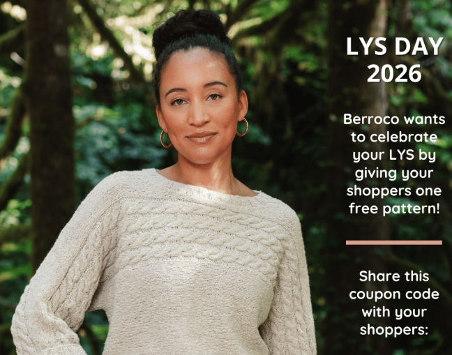 Berroco is offering a free pattern download code to give to your customers purchasing Berroco yarn on LYS Day. Share coupon code LYS2026with your customers to use on Ravelry or the Berroco website. To help spread the word, you can download and display this LYS Day flyer.