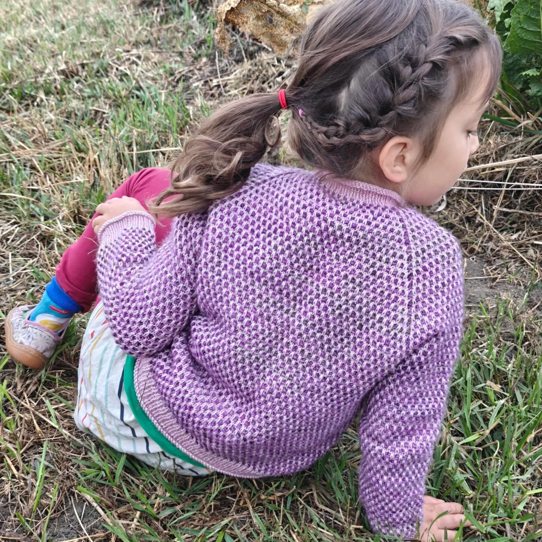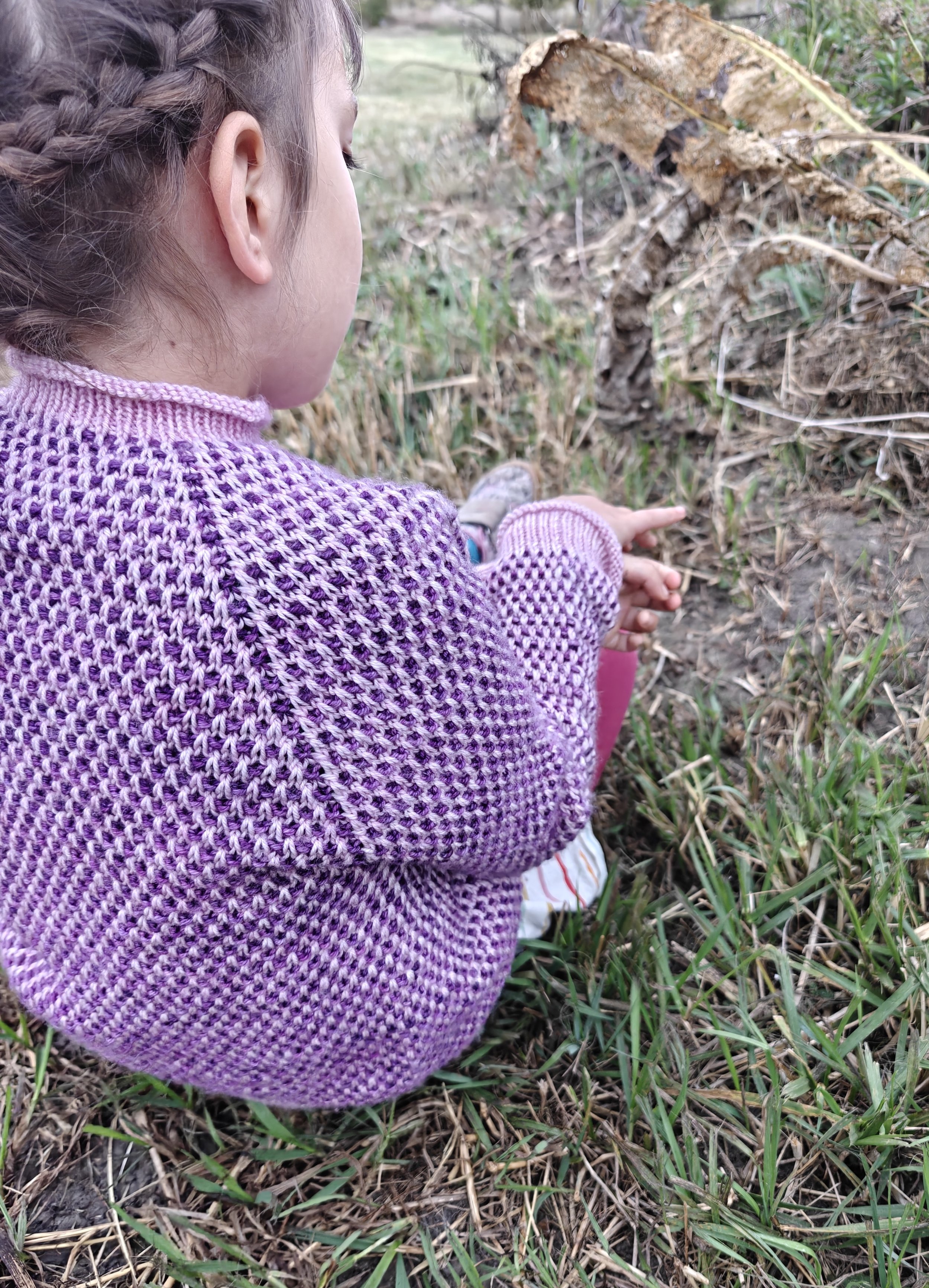 The pattern is for a children’s sweater, ages approximately 2 (4, 6, 8) (10, 12, 14) years old. Chest measurements of the finished garment are 24 3/4 (26 3/4, 28, 30 3/4) (31 3/4, 34, 35 1/4)“ / 62.5 (67.5, 71, 78) (79.5, 86.5, 89.5)cm. The sweater is intended to be worn with ease of 3-5in/7.5-12.5cm.